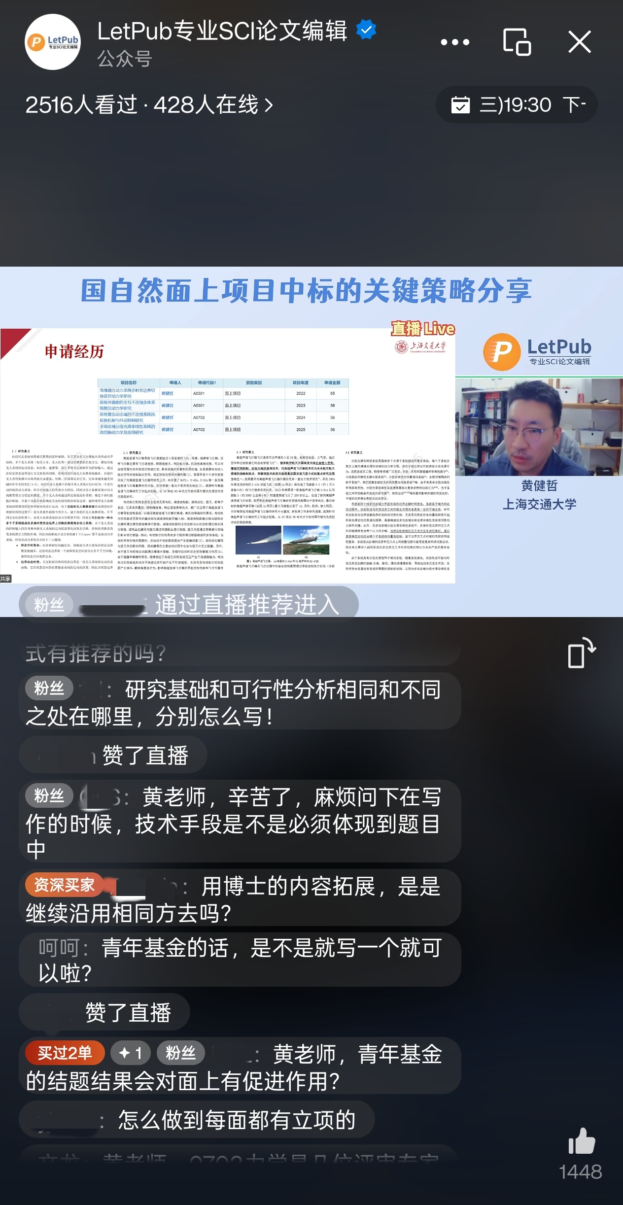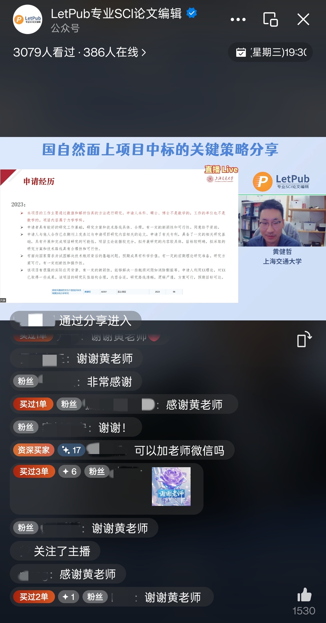 为帮助广大科研人员应对申报过程中可能遭遇的问题,LetPub精心策划了《国家自然科学基金申报攻略》系列线上辅导讲座。自2023年11月以来,我们已成功举办百余场线上免费直播,吸引了100万+名听众,反响热烈。