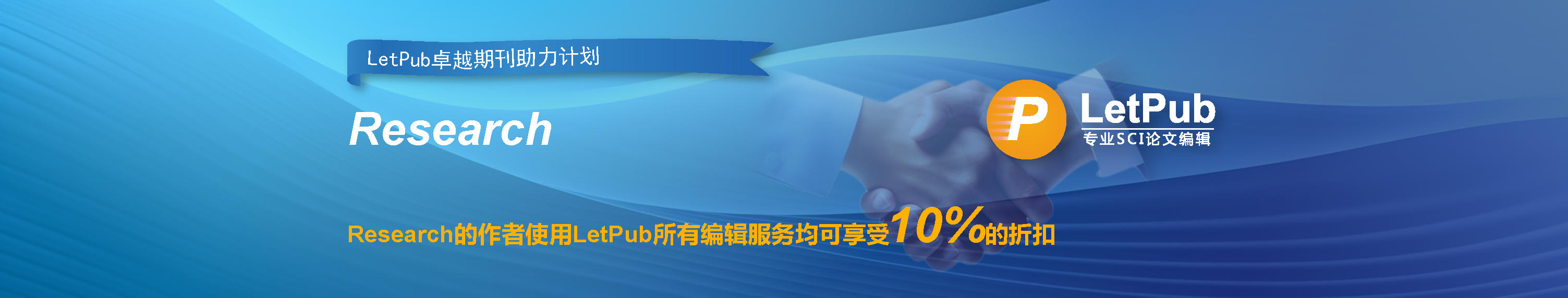 近日,中科院综合类1区Top期刊《Research》(科学研究)正式成为“LetPub卓越期刊助力计划”的一员。为方便更多的作者向《Research》投稿并发表高质量的科研成果,LetPub在全球最活跃的期刊信息查询及投稿经验分享社区上为《Research》期刊建立了专属主页,并向《Research》期刊的作者提供专属9折的编辑服务优惠(优惠券代码“Research10%”)。