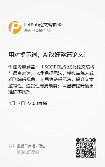 摘要:4月17日(周四) 晚10:00 ,LetPub网络研讨会将提供“用对提示词,AI帮您改好整篇论文!”实用教程!