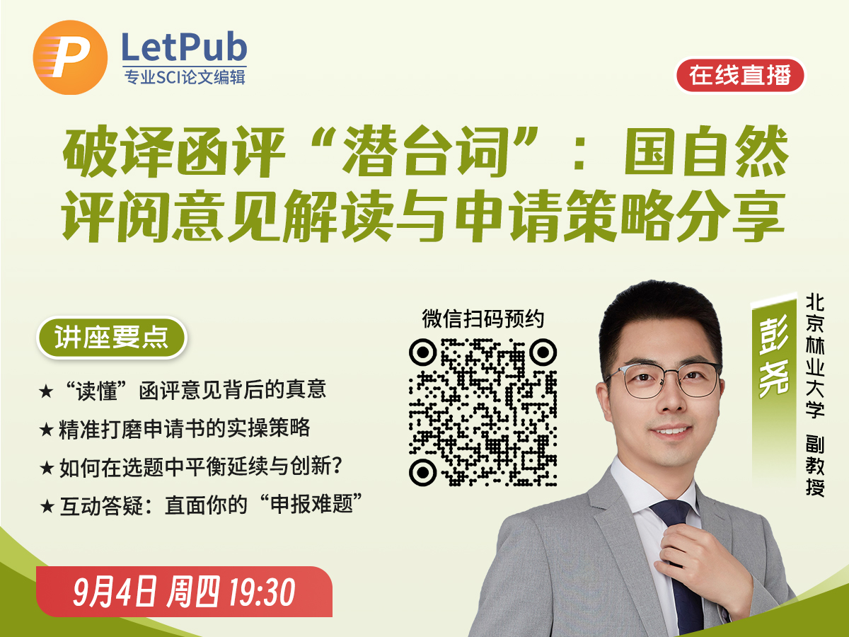 2025年国家自然科学基金评审结果已揭晓,有人成功立项,也有人止步评审。一纸函评意见,到底透露了哪些“潜台词”?2026年的申报之路,如何更精准发力?9月4日(周四)19:30,LetPub 特邀 国家自然科学基金评审专家、北京林业大学副教授彭尧老师,带来一场聚焦评阅意见解析与申请书质量提升的实战经验讲座!