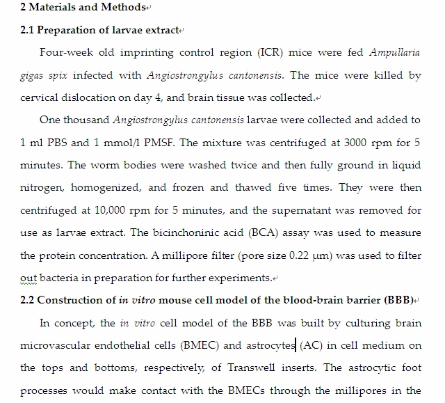 文章已发表在SCI期刊《PLOS ONE》,标题为: In Vitro Study of the Effects of Angiostrongylus cantonensis Larvae Extracts on Apoptosis and Dysfunction in the Blood-Brain Barrier (BBB) (点击链接可查看全文)