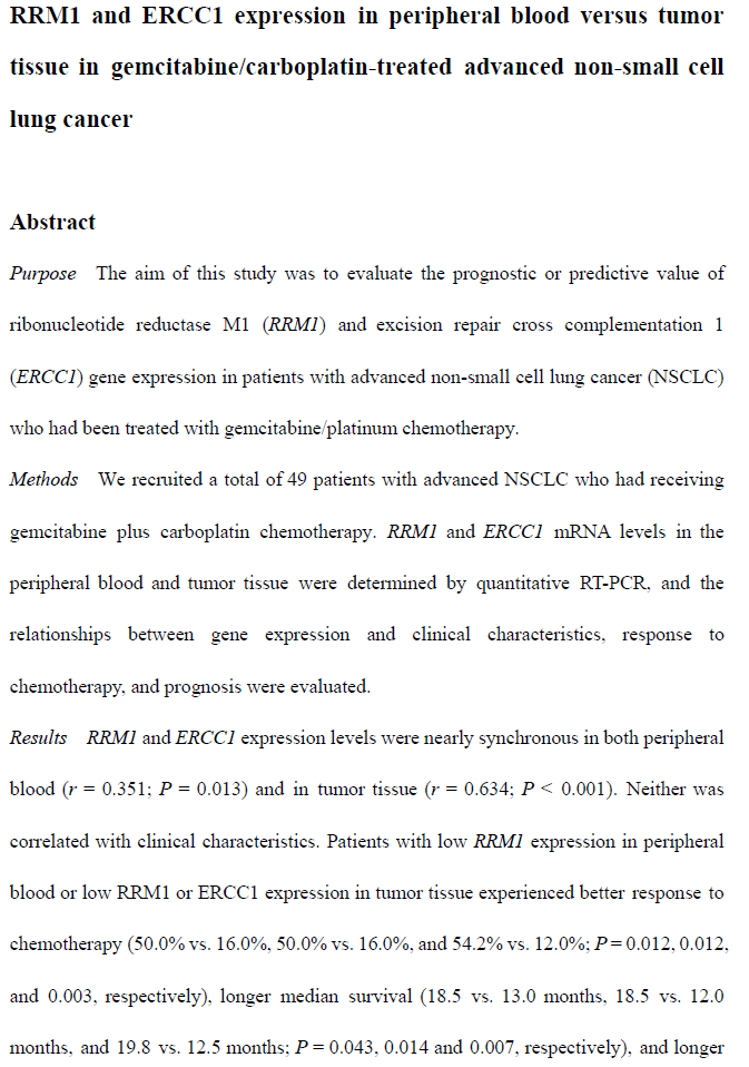 文章已发表在SCI期刊《Cancer Chemotherapy and Pharmacology》,标题为: RRM1 and ERCC1 expression in peripheral blood versus tumor tissue in gemcitabine/carboplatin-treated advanced non-small cell lung cancer (点击链接可查看全文)