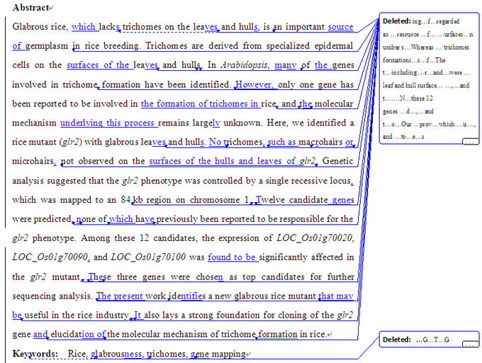 文章已发表在SCI期刊Journal of Genetics and Genomics(2013 IF 2.076,JCR2012),标题为: Characterization and Fine Mapping of GLABROUS RICE 2 in Rice (点击链接可查看全文)