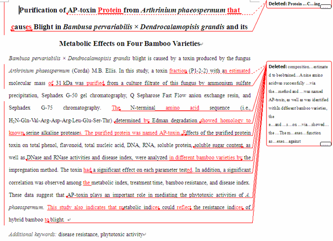 文章已发表在SCI期刊PHYTOPATHOLOGY (2013 IF 2.968,JCR2012),标题为: Purification of Protein AP-Toxin fromArthrinium phaeospermum Causing Blight inBambusa pervariabilis × Dendrocalamopisis grandis and Its Metabolic Effects on Four Bamboo Varieties (点击链接可查看全文)