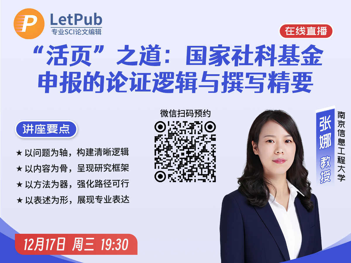 12月17日(周三)19:30,LetPub特邀南京信息工程大学 张娜教授,带来一场面向科研人员的国家社科基金申报指导讲座。张老师将以自身成功申报多项国家自然科学基金与国家社科基金的经验为例,深入解析如何从选题、内容、方法到语言表达,构建高质量“活页”逻辑链条,帮助科研人员掌握高命中率申报的底层思维与实操技巧。