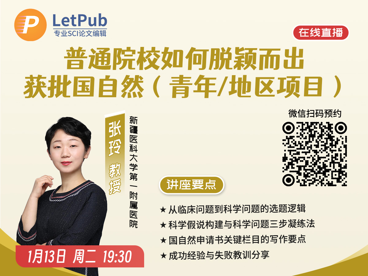 1 月 13 日(周二)19:30,LetPub 特邀新疆医科大学第一附属医院张玲教授,分享其在国自然项目申报过程中的实战经验,从选题逻辑、科学问题凝练、申请书写作到经验反思,为您呈现一条清晰、有效的国自然申报路径。
