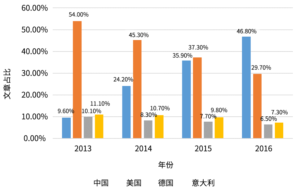 中国作者发表在Oncotarget的文章量俨然已占据了半壁江山,也难怪国内许多学者对该刊非常反感,与当年PLoS One的遭遇十分类似,目前已被一些机构“拉黑”。有评论指出该期刊编辑对选择审稿人不负责任,审稿和决策过程较随意,导致文章“来者不拒”;但也有不少作者遇到严格的同行评议过程致使被拒稿的情况。投稿过程的不确定因素太多,单凭一些个例就下定论似乎也并不合理。至于中国作者是否大量灌水的问题,确实很难说清,至少我们没有充足的理由去判断这些已发表论文的水平究竟如何,在此我仅针对近4年中国作者发表文章的被引频次作了初步的统计。如图所示,尽管中国作者发文量居高不下,但相对应的被引用数量占比也随之成比例地显著增加,2016年就占据了期刊总引用量的30.46%。这或许也证明了国人发表的文章水平尚可,一般能获得比较合理的被引用水平,似乎也没有大量发表了无人引用的“灌水”文章。