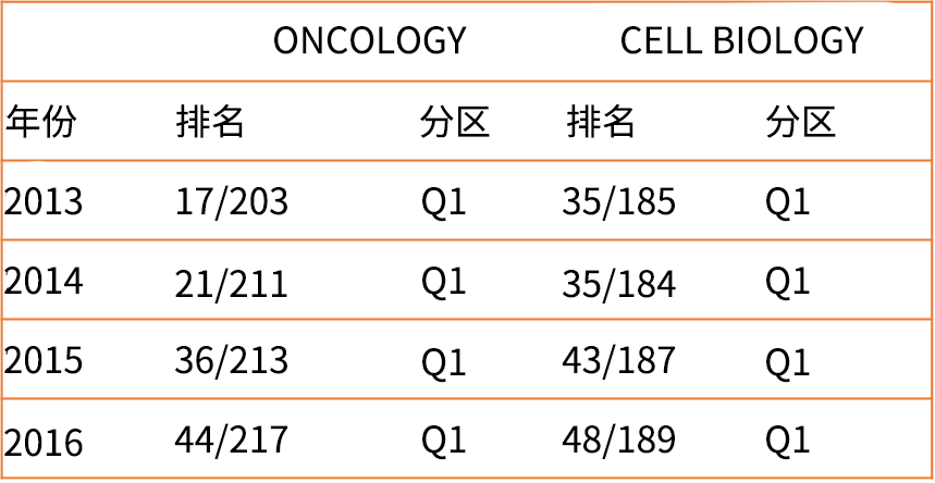 Oncotarget近4年JCR期刊分区相对比较稳定,几乎属于肿瘤学和细胞生物学学科领域内的Q1期刊,然而期刊排名却是逐年下降,2016年在细胞生物学的期刊分区已降至Q2。
