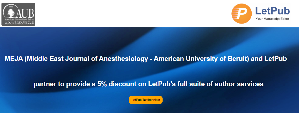 近日,贝鲁特美国大学(American University of Beirut)期刊《中东麻醉学杂志》(Middle East Journal of Anesthesiology,MEJA)与LetPub建立了合作伙伴关系,正式向作者推荐使用LetPub专业SCI论文编辑和研究交流服务。MEJA相信投稿阶段经过LetPub提供编辑支持服务,将极大地改善他们收到的稿件质量,因而发表更具影响力的论文。