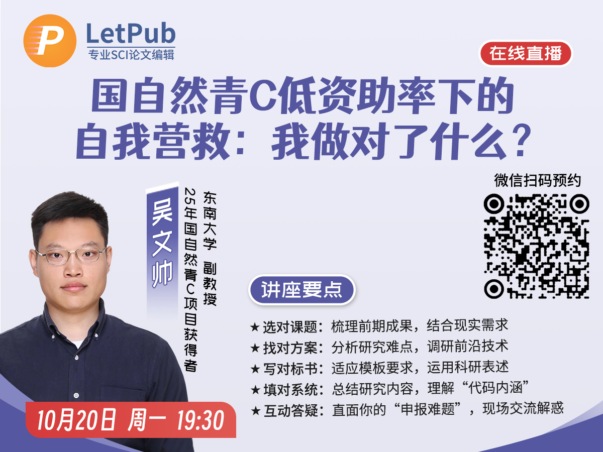 摘要:10月20日(周一)19:30,LetPub 特邀 2025年化学科学部国家自然科学基金青C项目获得者、东南大学副教授吴文帅老师,分享他在申报青年基金过程中的关键策略与实战经验。