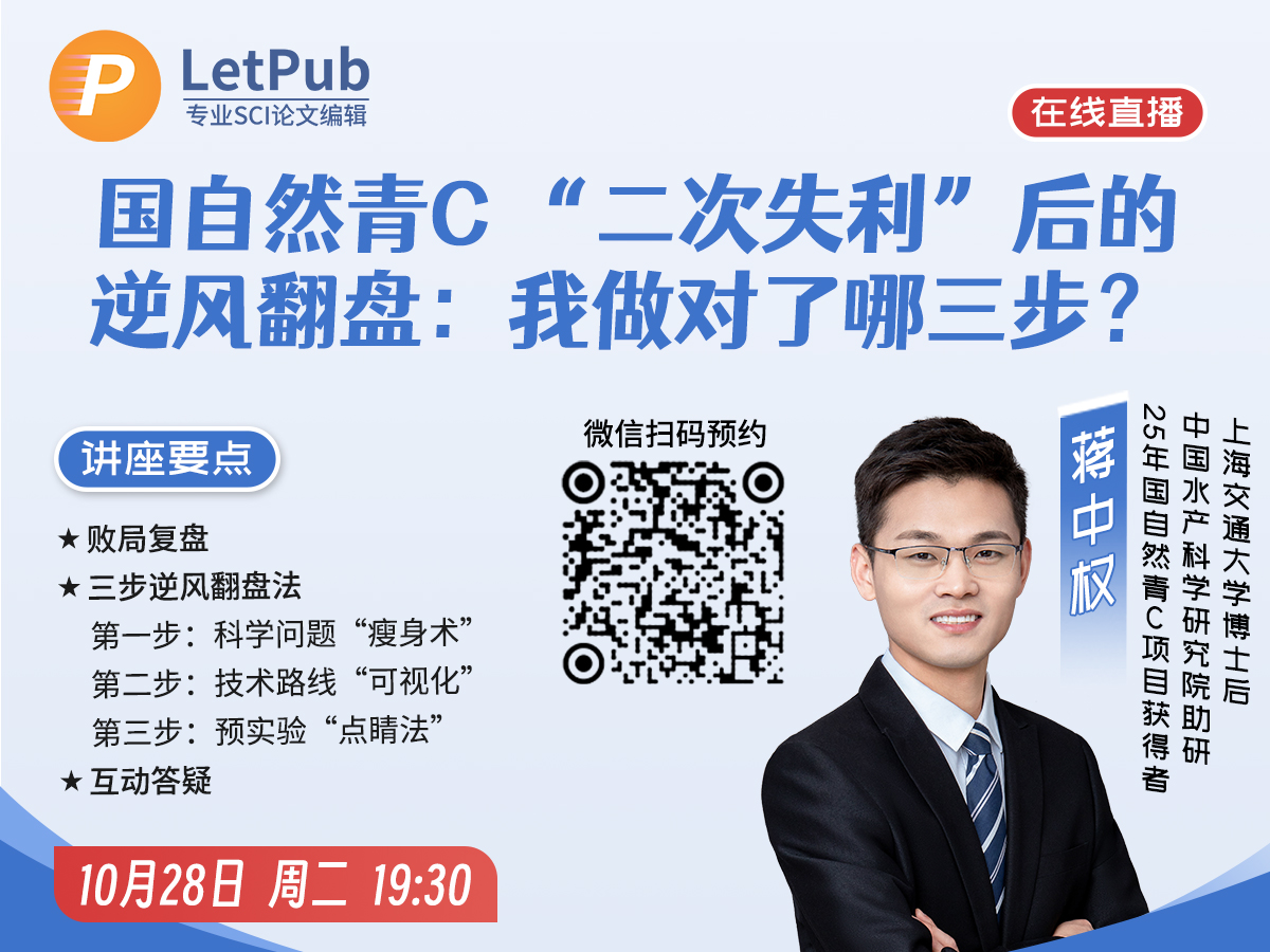 10月28日(周二)19:30,LetPub 特邀 2025 年国自然青年项目C类获得者、上海交通大学博士后蒋中权老师,带来一场干货满满的实战分享。他将用亲身经历告诉你:如何通过败局复盘 + 函评意见解读 + 精准修改,让申请书“越改越有分”。