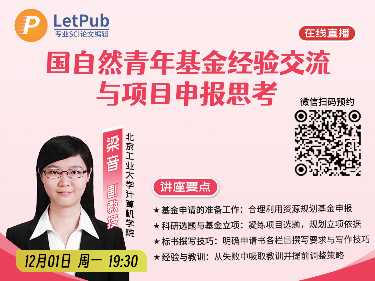 在国自然基金的激烈竞争中,如何从众多申请中脱颖而出?12月1日(周一)19:30,LetPub 特邀北京工业大学计算机学院副教授 梁音老师,为青年科研人员带来一场实战型基金申请指导课。